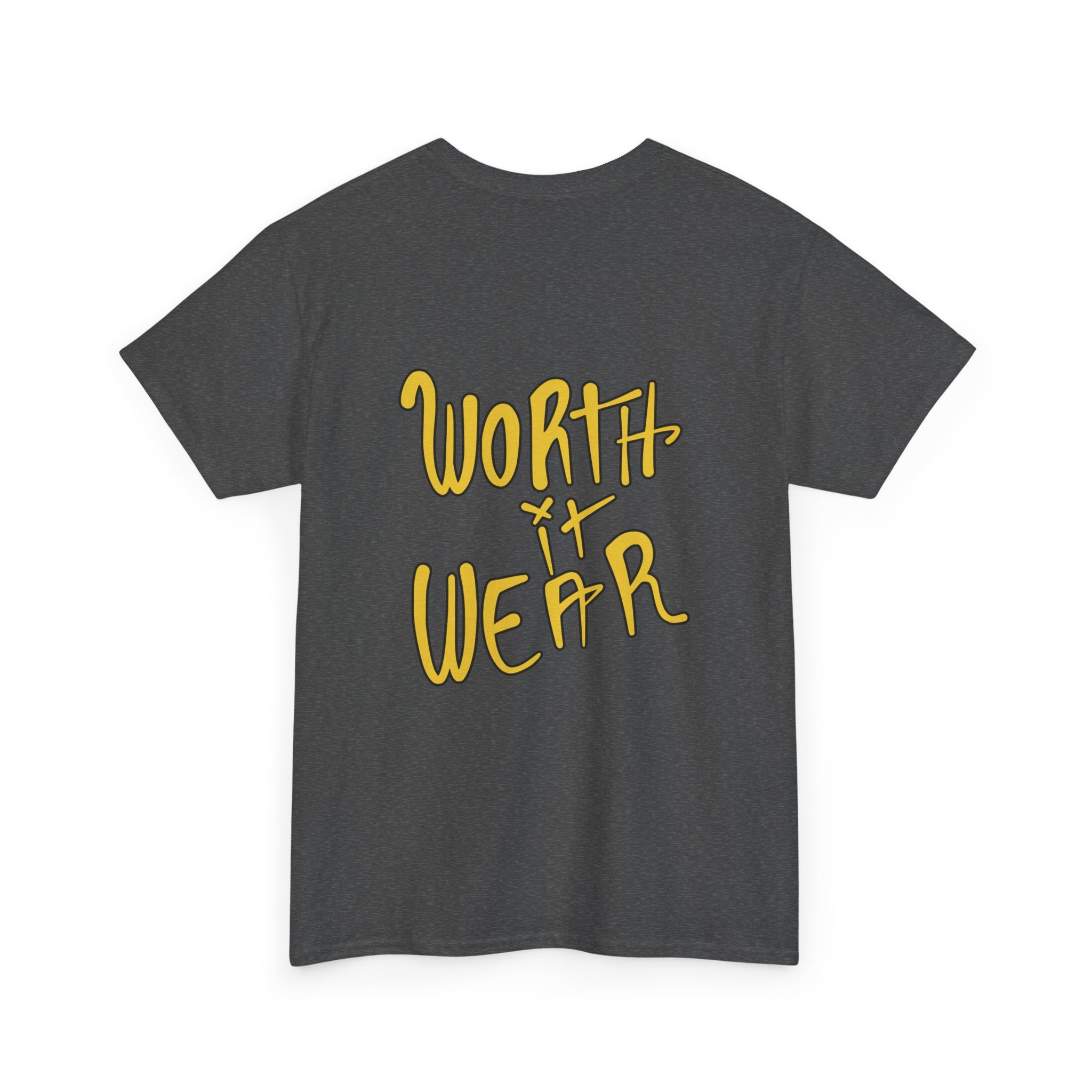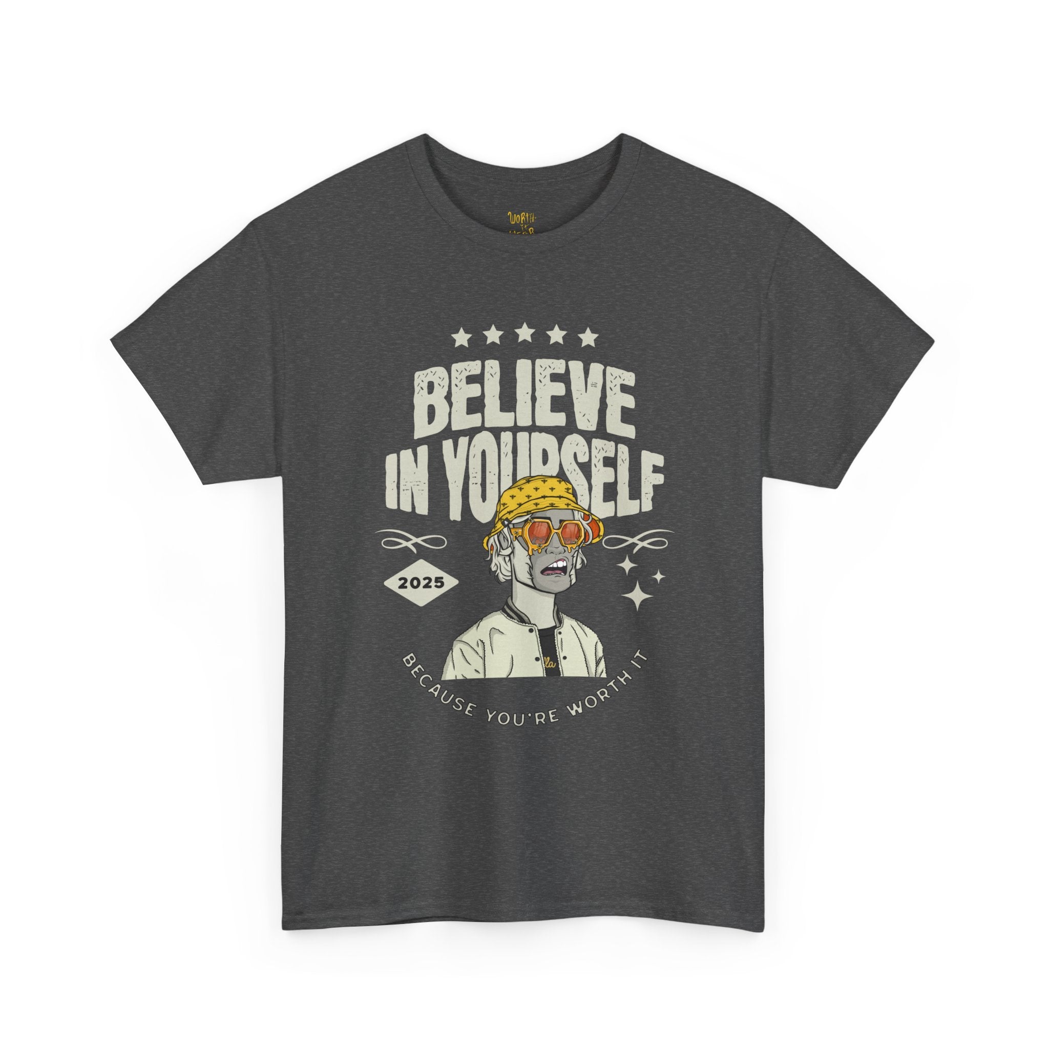 This soft, medium-weight tee carries a quiet confidence — a retro-inspired graphic on the front reads “Believe in Yourself” above a sunlit, vintage character, while the back sports a warm, handwritten “Worth It Wear” in mustard tones. The muted charcoal background makes the artwork pop without shouting. Wear it on slow mornings with coffee, at open-mic nights, or when you need a wearable reminder that small choices add up. The fit is relaxed and familiar; it drapes easy, moves with you, and keeps the vibe approachable and honest. It’s a shirt that reads like a friendly nudge: casual, thoughtful, and a little nostalgic.