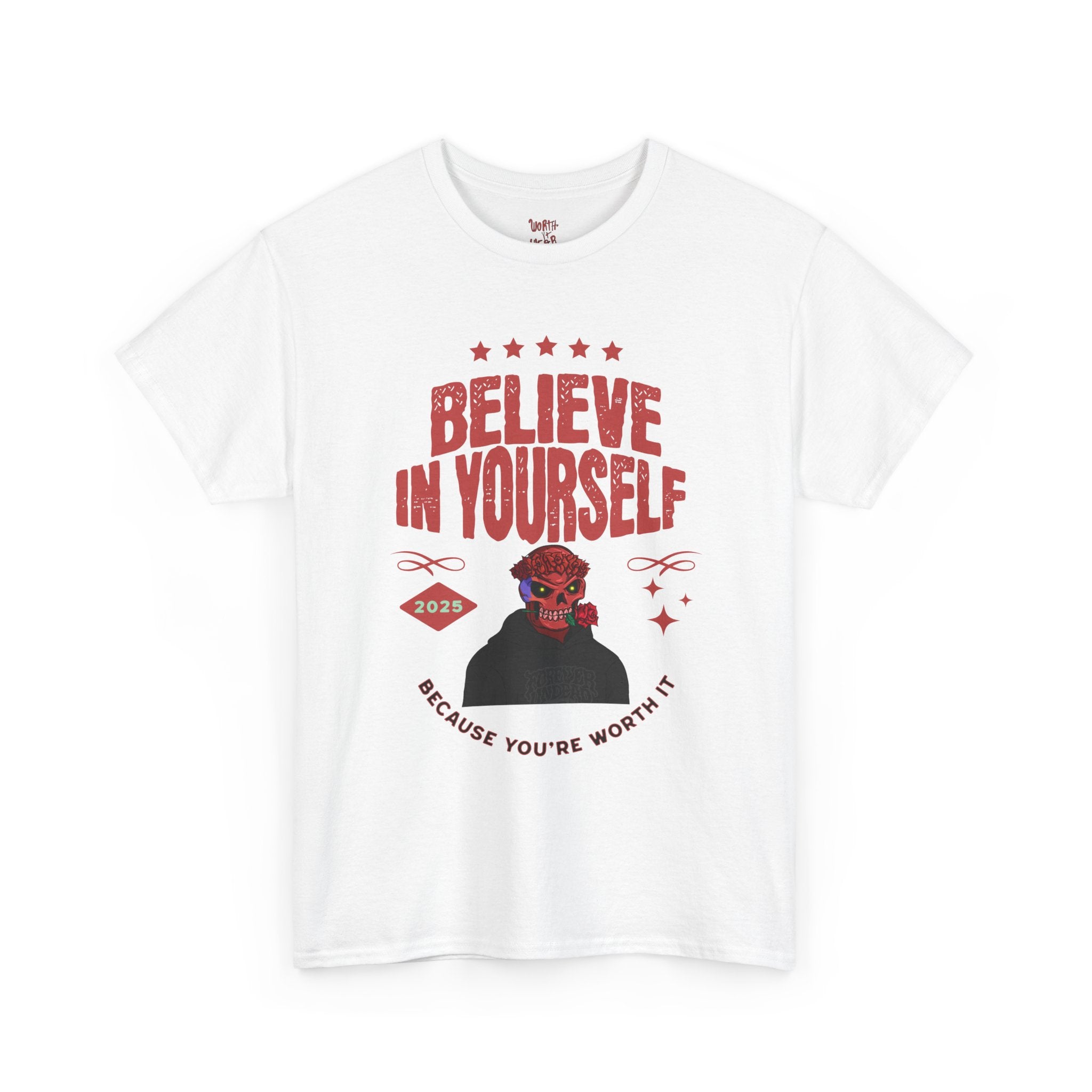 A soft, breathable cotton tee that pairs bold, vintage-inspired graphics with a gentle message: Believe in Yourself. The front features a retro poster-style illustration and uplifting headline, while the back carries playful hand-lettered text reading "Worth It Wear" — a cheeky, confident reminder you can wear out loud. The relaxed classic fit and crew neckline make it easy to layer or wear solo. Subtle details like a ribbed collar, tear-away label, and sturdy shoulder tape keep the shirt comfortable and long-lasting. Made with responsibly sourced cotton and printed with crisp, durable techniques, this tee feels like an everyday pick-me-up that you reach for when you want to show confidence without shouting it.