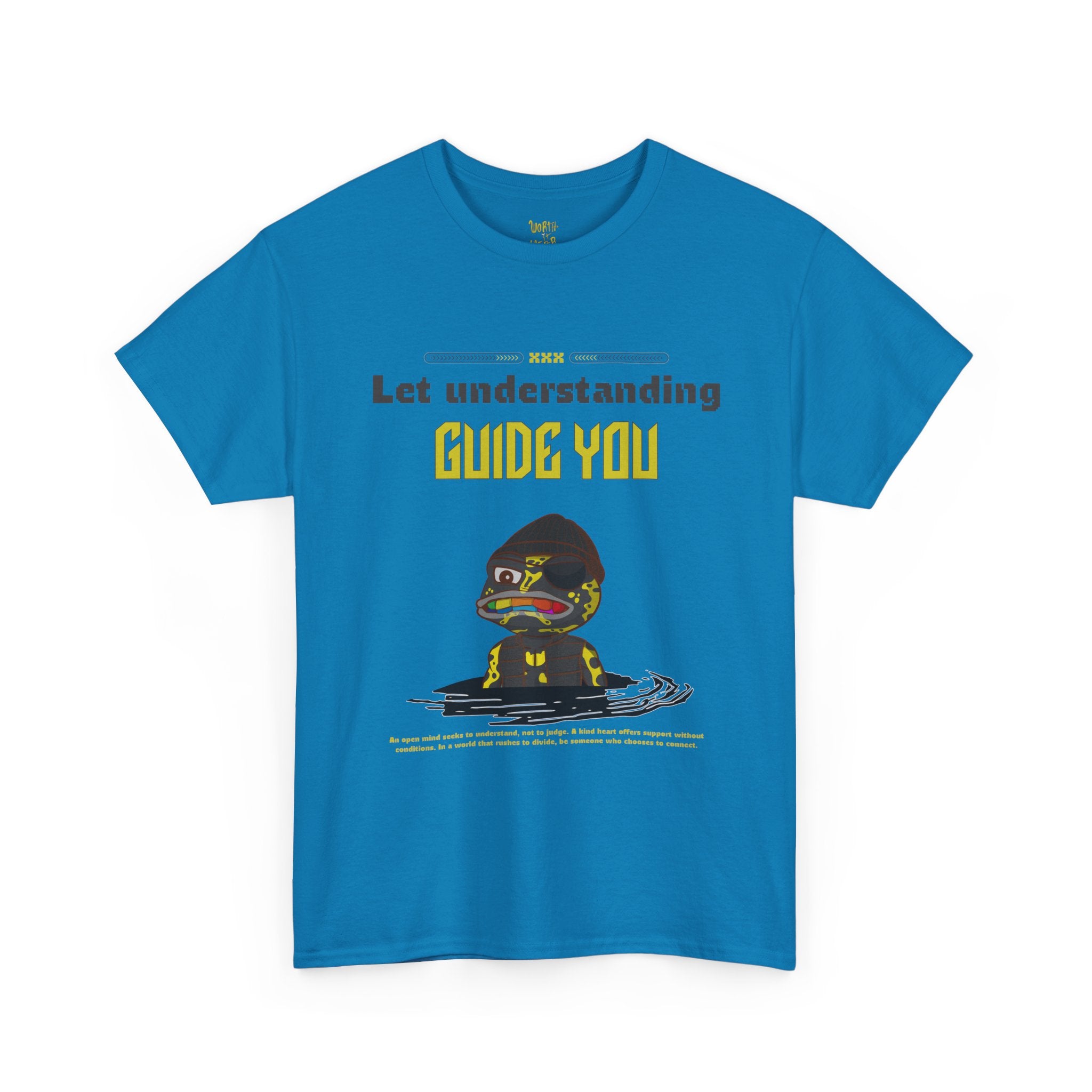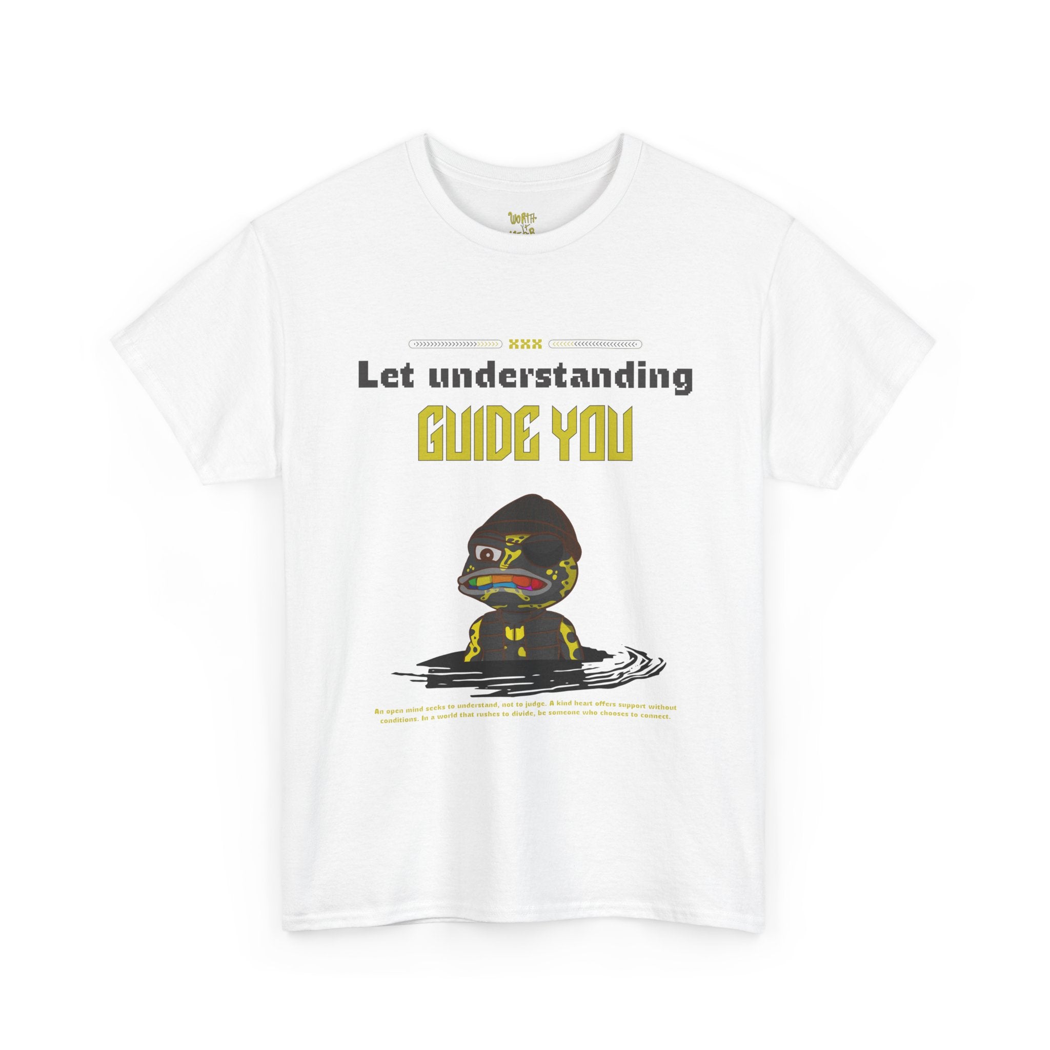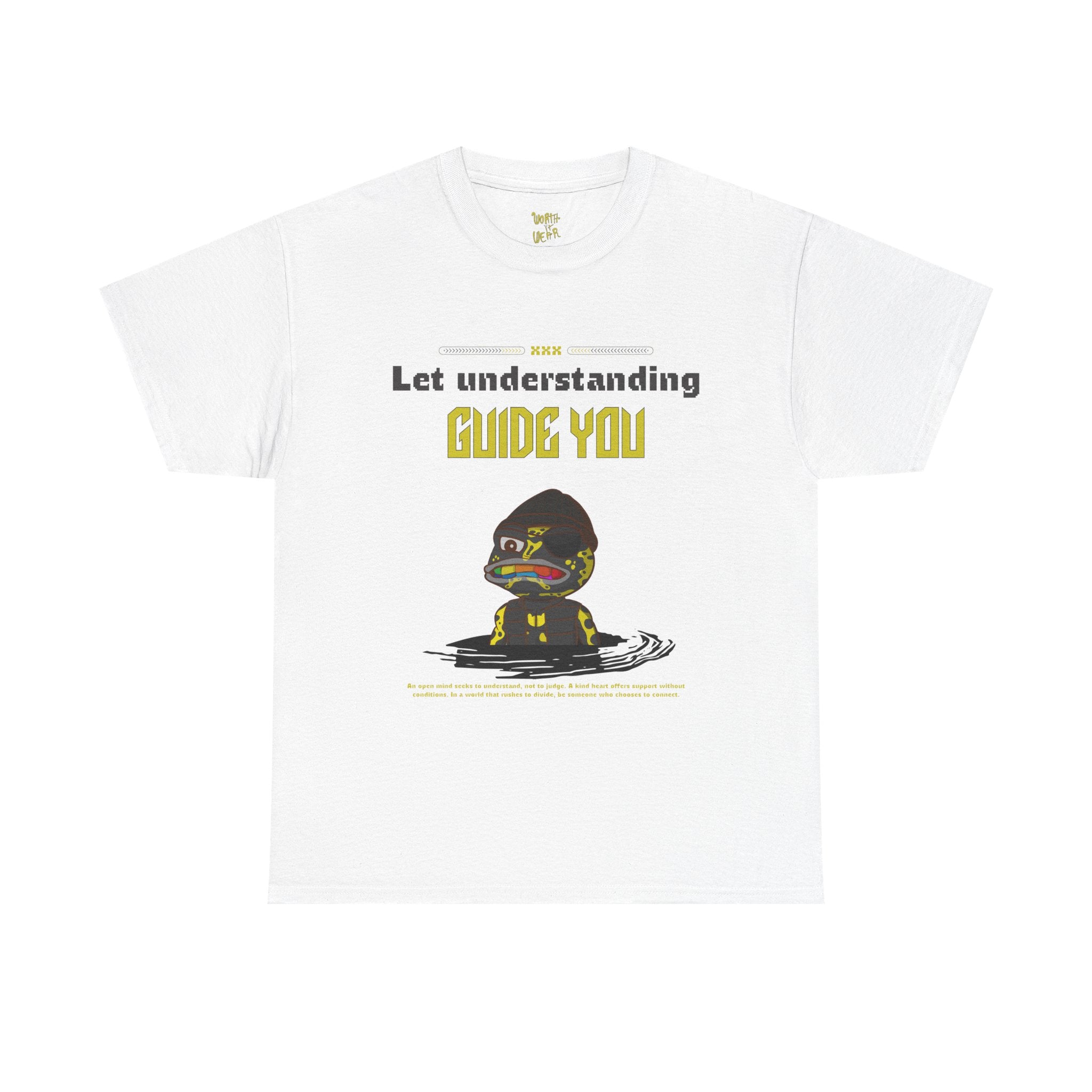 A soft, classic-fit cotton tee that wears like a quiet statement. Front art shows a thoughtful character emerging from gentle ripples, captioned “Let understanding guide you,” while the back carries an uplifting hand-lettered slogan, “Worth it Wear.” It feels like a wearable reminder to slow down, listen, and move through the world with intention. Lightweight but sturdy, the shirt holds prints crisply and keeps its shape thanks to reinforced shoulders and a ribbed collar. Slip it on for reflective mornings, community meetups, or low-key days when your outfit should match your mindset.