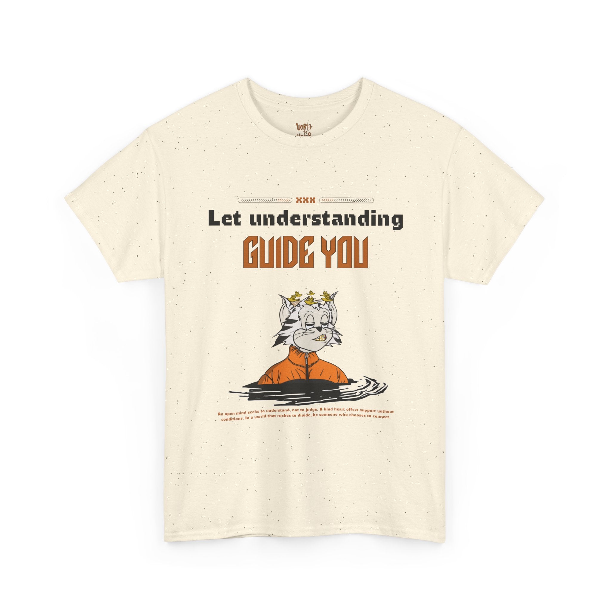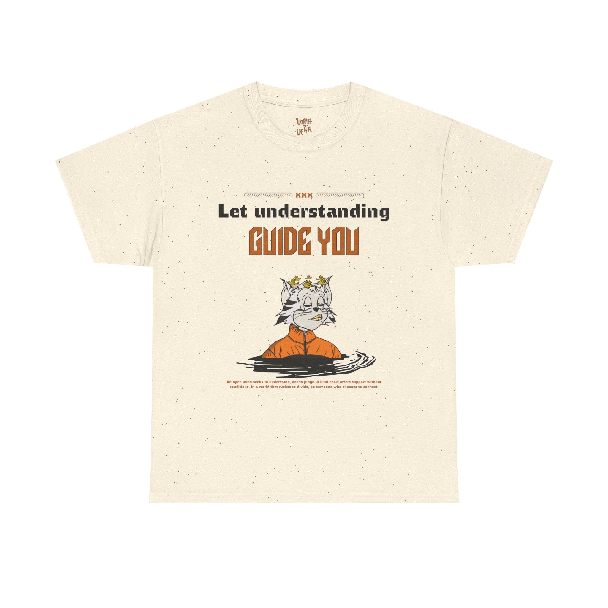 This classic cotton tee carries a quiet, thoughtful energy — simple enough for everyday wear, yet expressive enough to start conversations. The front shows a calm, illustrated figure with the line “Let understanding guide you,” inviting a moment of reflection. On the back, warm hand-lettered text reads “Worth it We’re,” a playful, slightly whimsical statement that pairs well with the front’s contemplative message. The soft white fabric and clean crew neckline make this shirt an easy layer for slow mornings, coffee runs, or evenings spent with close friends. It feels like a wearable reminder to stay patient, curious, and kind — the kind of shirt someone who values thoughtful living would reach for again and again.