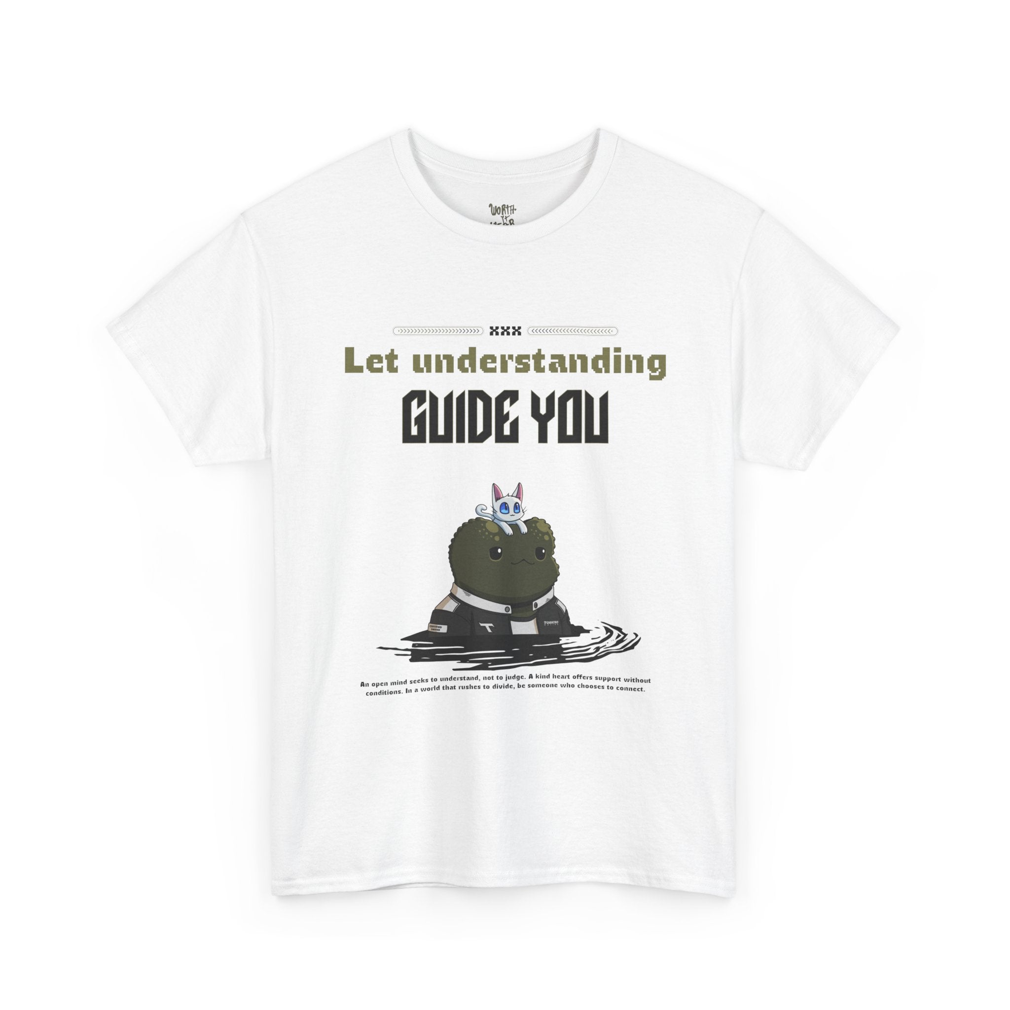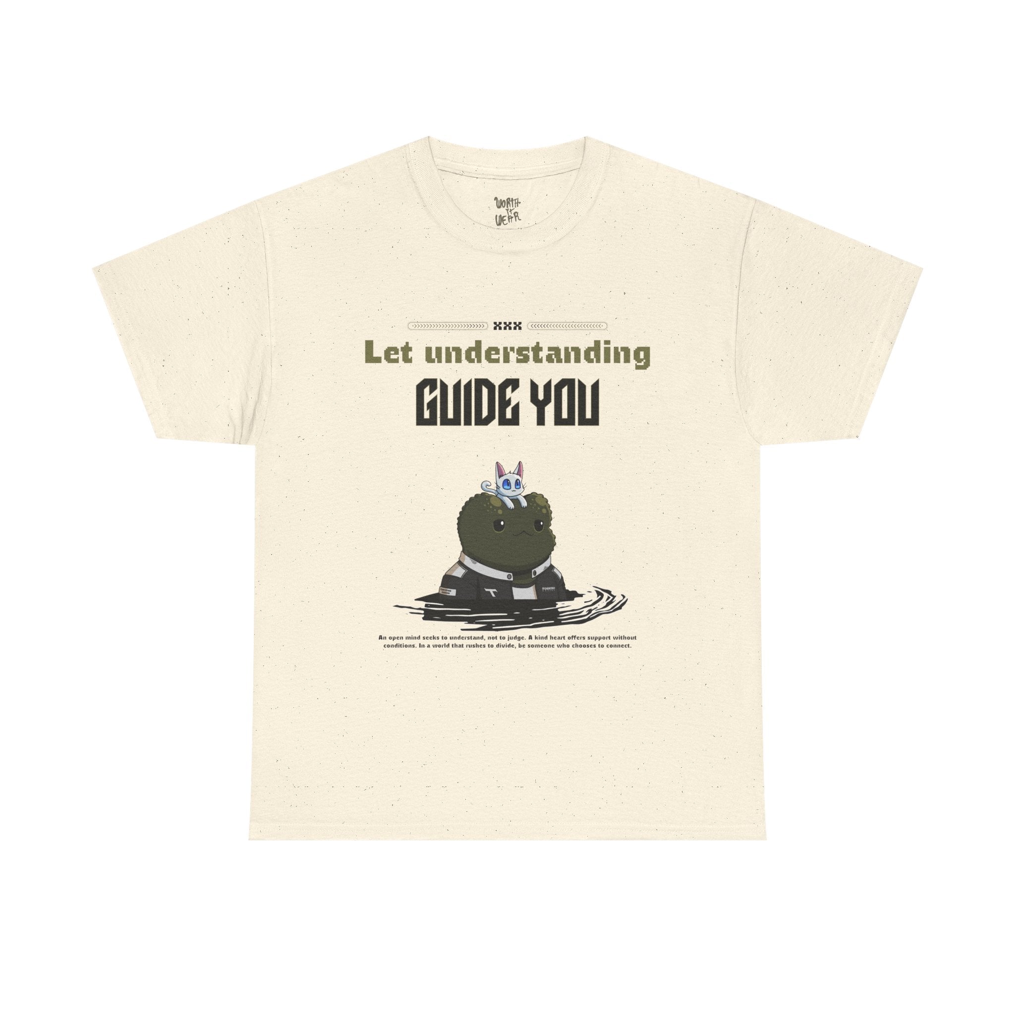 A soft, sturdy tee designed for quiet confidence. The front shows a playful character perched on a stack of books beneath the phrase “Let understanding guide you,” while the back carries a hand-lettered “WORTH IT WEAR” in faded tones. It feels like a wearable reminder to stay curious and kind — the kind of shirt you pull on for a long walk, a late-night study session, or a slow coffee run. The classic crew neck and relaxed fit let the message sit comfortably without shouting. Subtle vintage coloring and crisp printing give it a lived-in look that pairs easily with jeans, layered flannels, or a cozy cardigan.